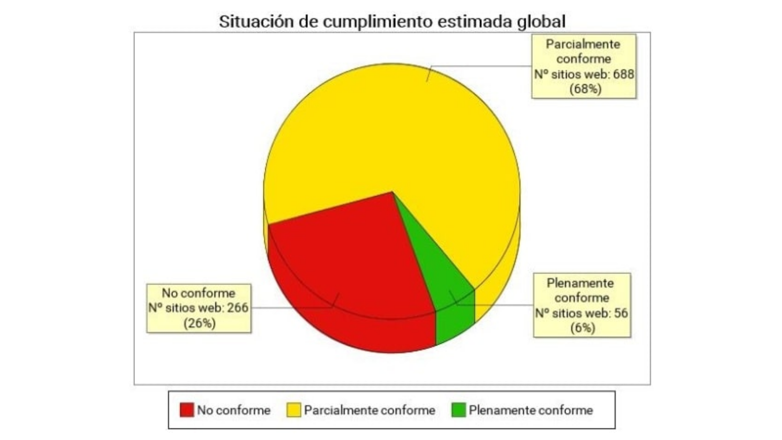 Mientras, el informe en profundidad apunta a un cumplimiento parcial para el 85% de las webs y a un incumplimiento absoluto para el 10% restante.