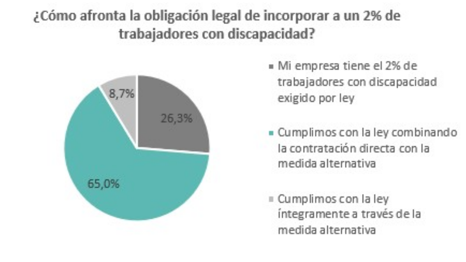 Solo un 26,3% de las empresas con más de 50 empleados en España ha conseguido incorporar al 2% de trabajadores con discapacidad exigido por legislación. La mayoría la mayoría (un 65%) combina la contratación directa con las medidas alternativas contempladas por normativa*, mientras que un 8,7% se acoge íntegramente a dichas medidas alternativas, según las conclusiones del estudio que ha llevado a cabo la Fundación Adecco para conocer el grado de cumplimiento real de esta obligación al cumplirse cuatro décadas de su entrada en vigor.